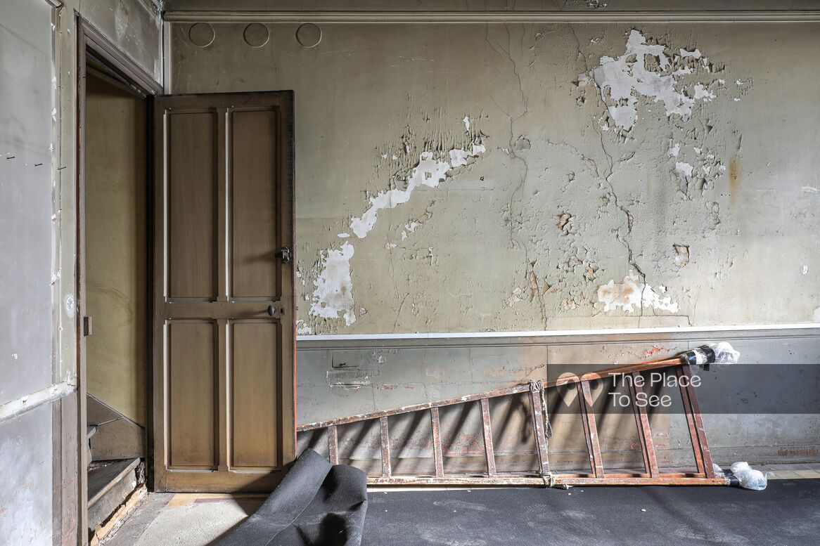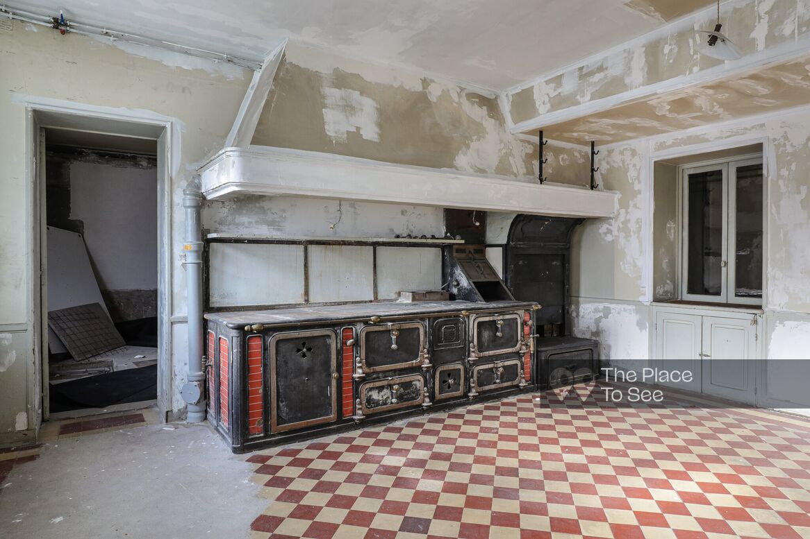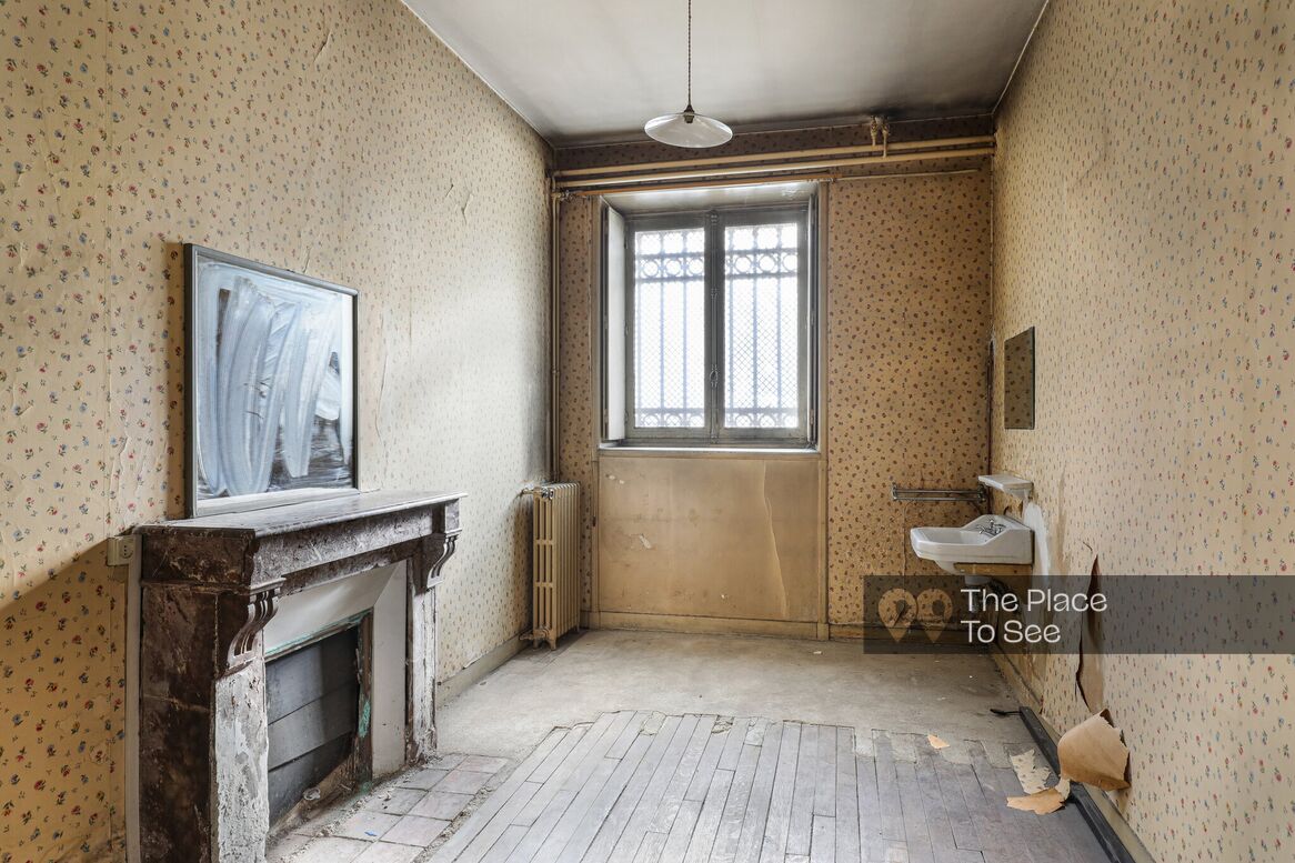 Here you’ll find a spacious period kitchen dominated by an old cast-iron cooking range, as well as a wide corridor leading to a bedroom with torn wallpaper, complete with a fireplace and a washbasin. This corridor also provides access to an old pantry and a small courtyard.