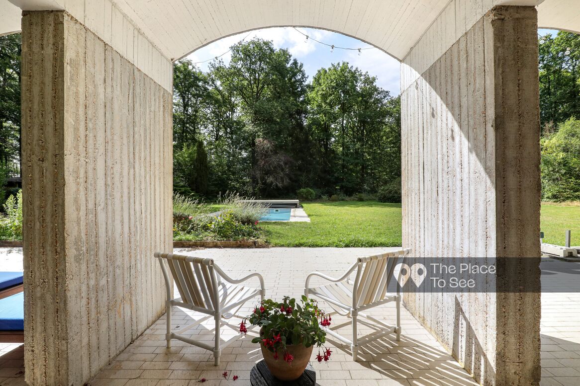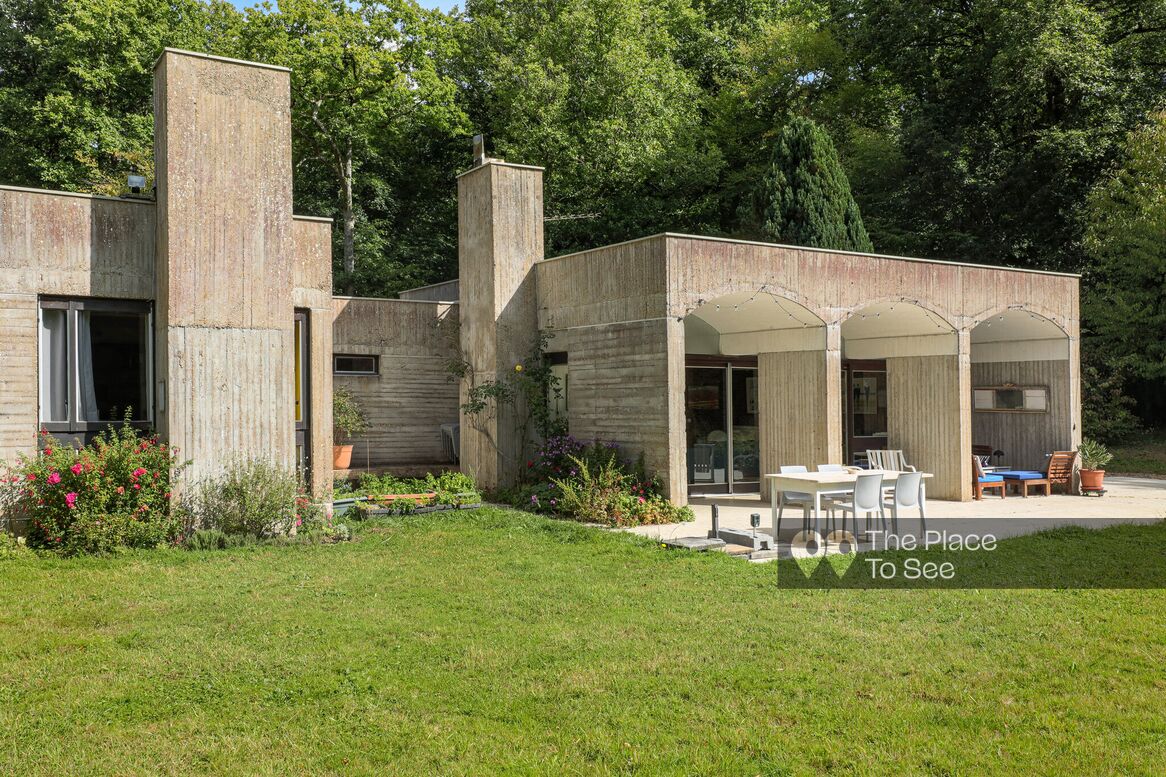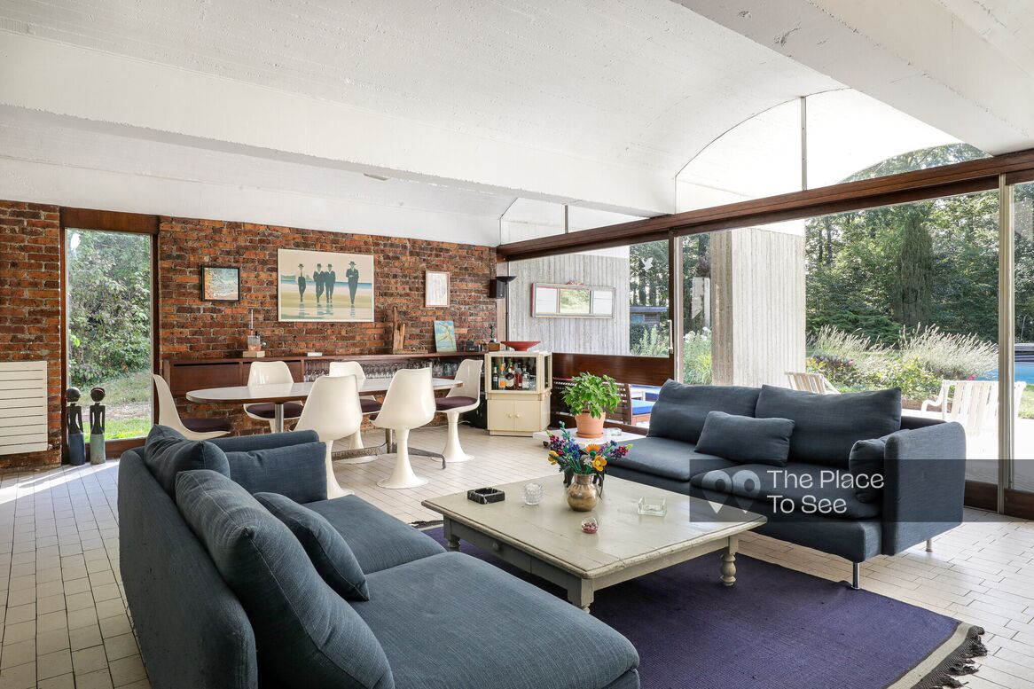 Brutalist house with concrete structure and vaults. 70's era furniture.
