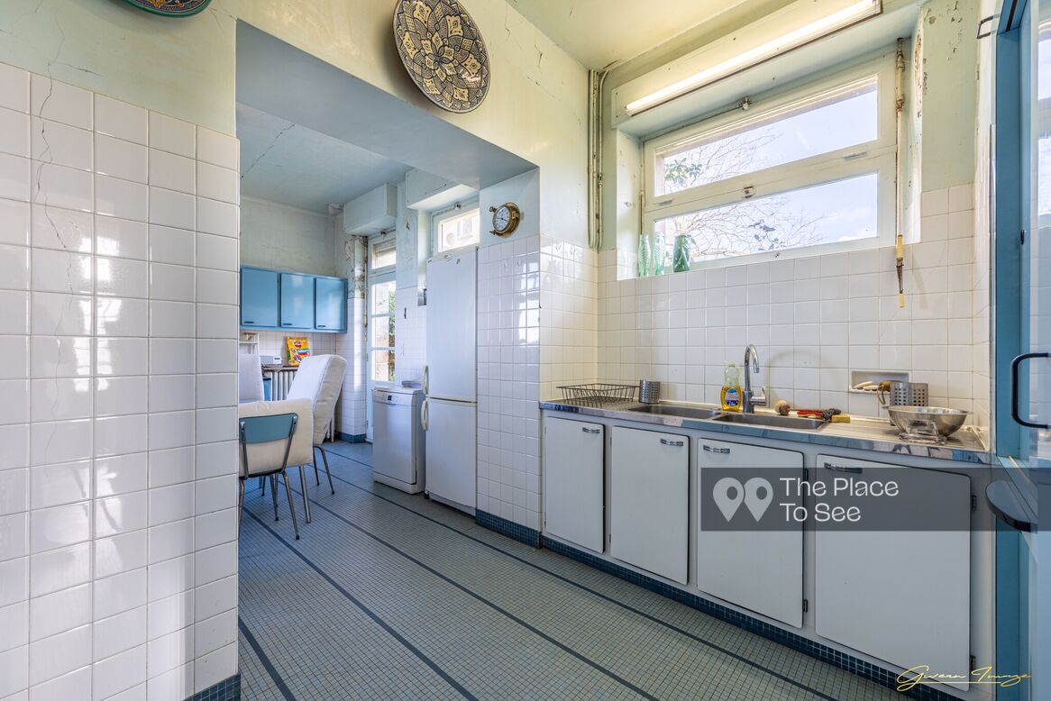 The kitchen, with a 1960s–70s Formica style, contrasts with the dining room, which features a slightly rustic fireplace.