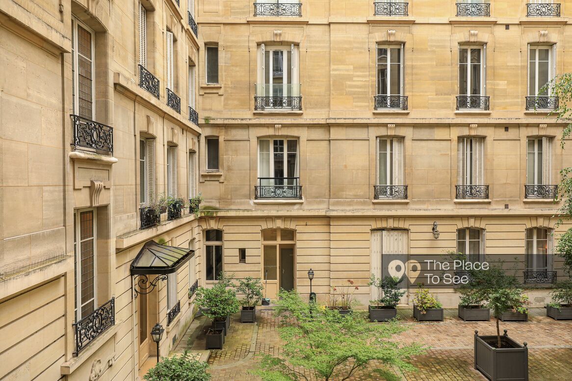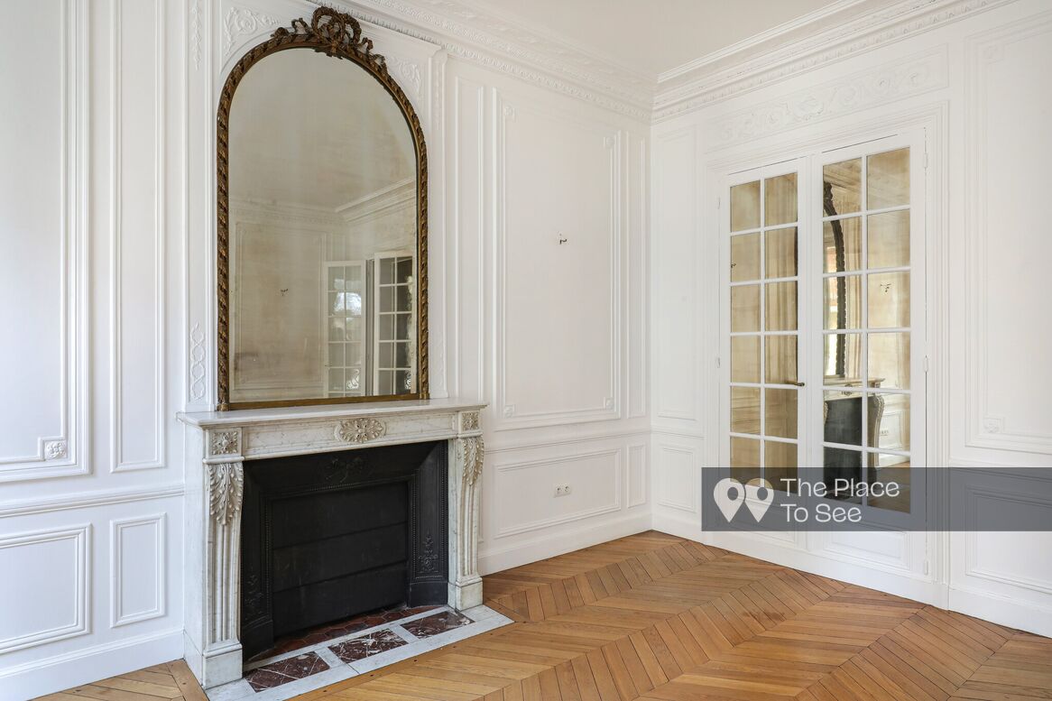 Haussmann-style apartment with white walls and refined moldings. A marble fireplace adds an elegant and authentic touch.