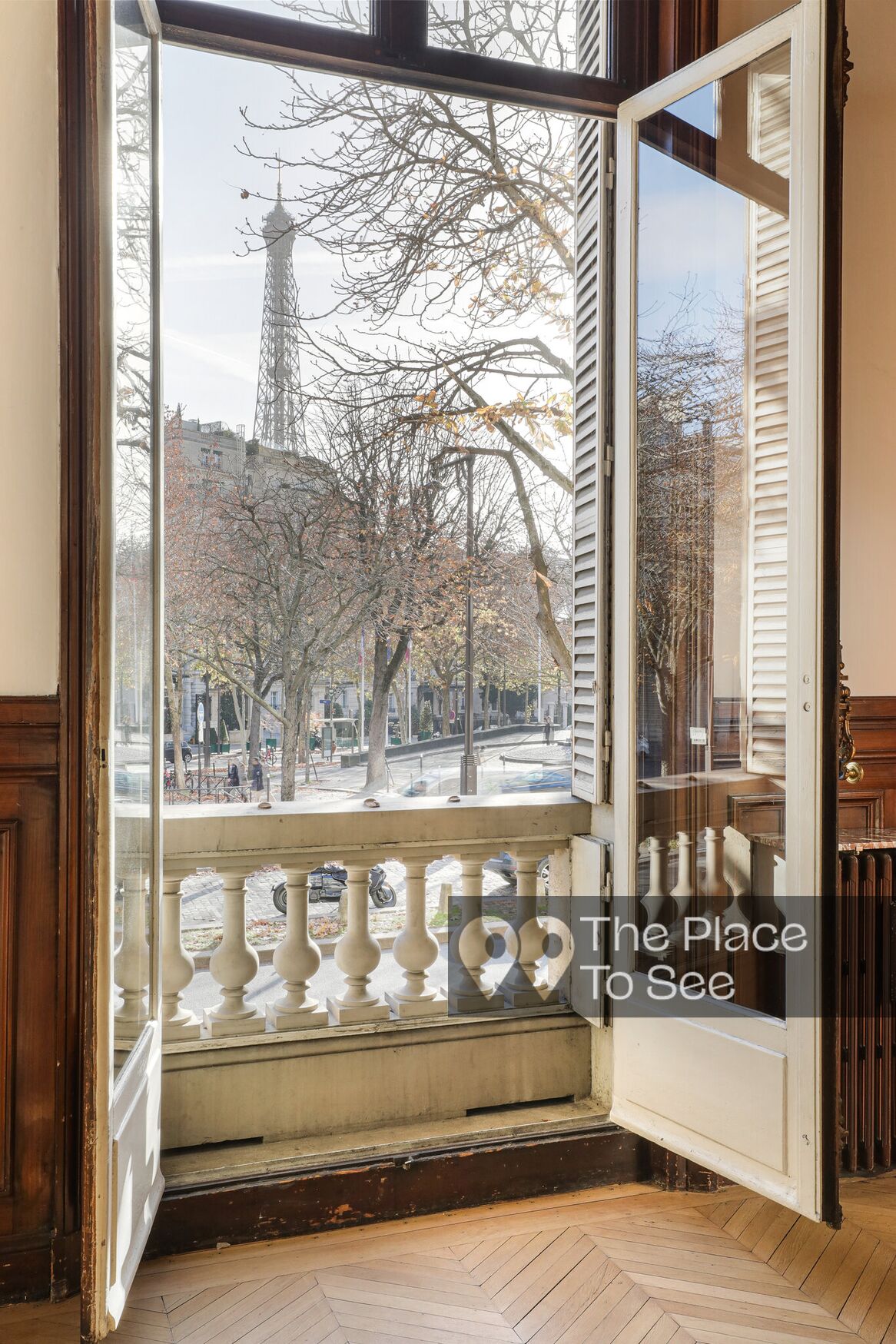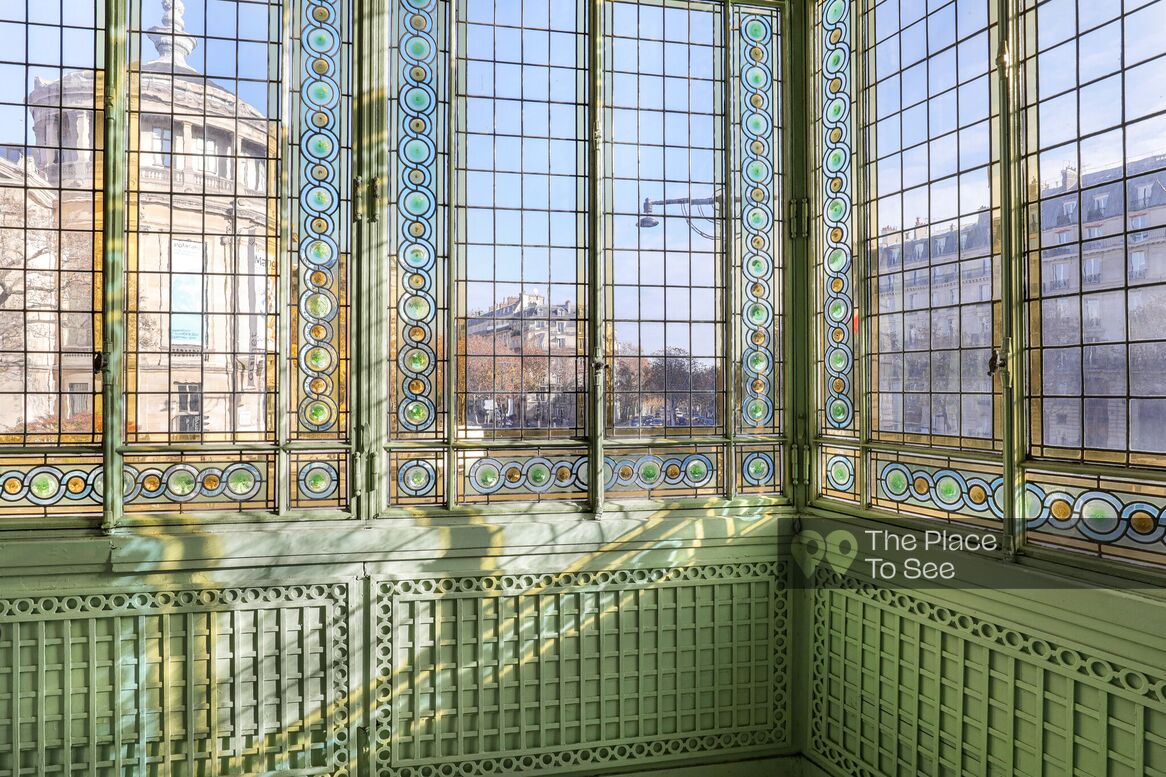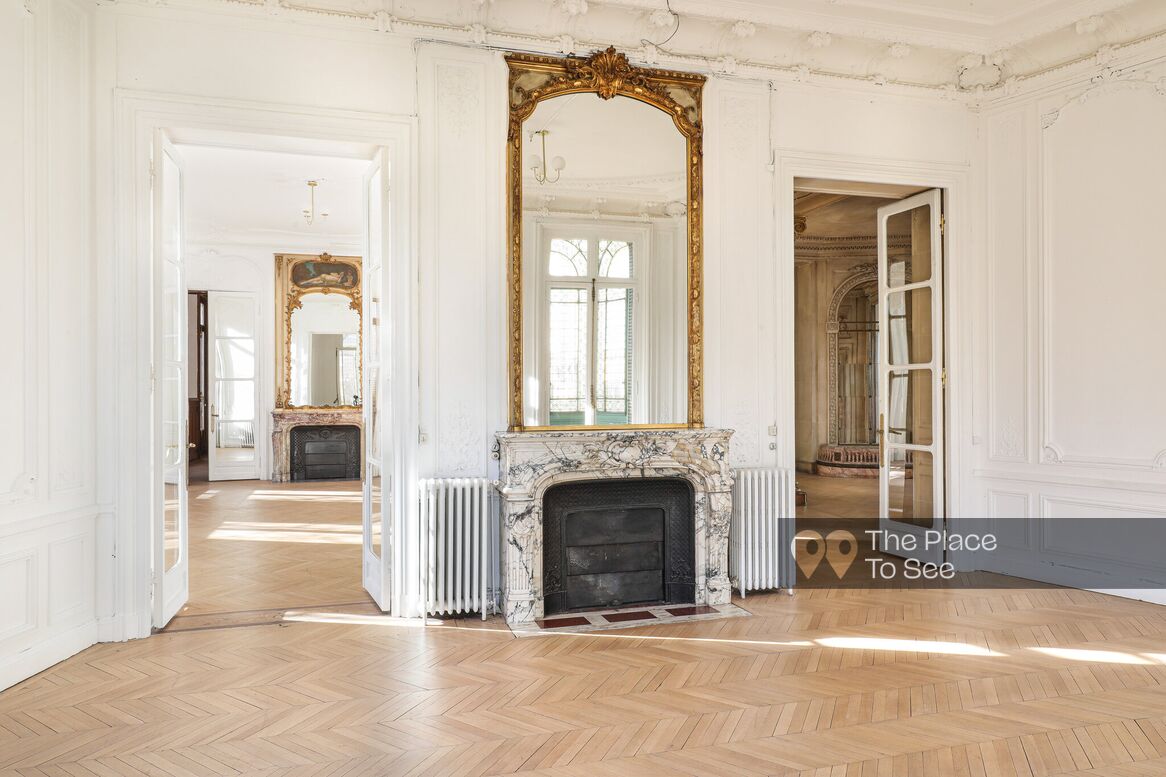 This prestigious Haussmann-style apartment spans the ground floor and first floor of the building, opening onto a grand entrance gallery adorned with marble columns.