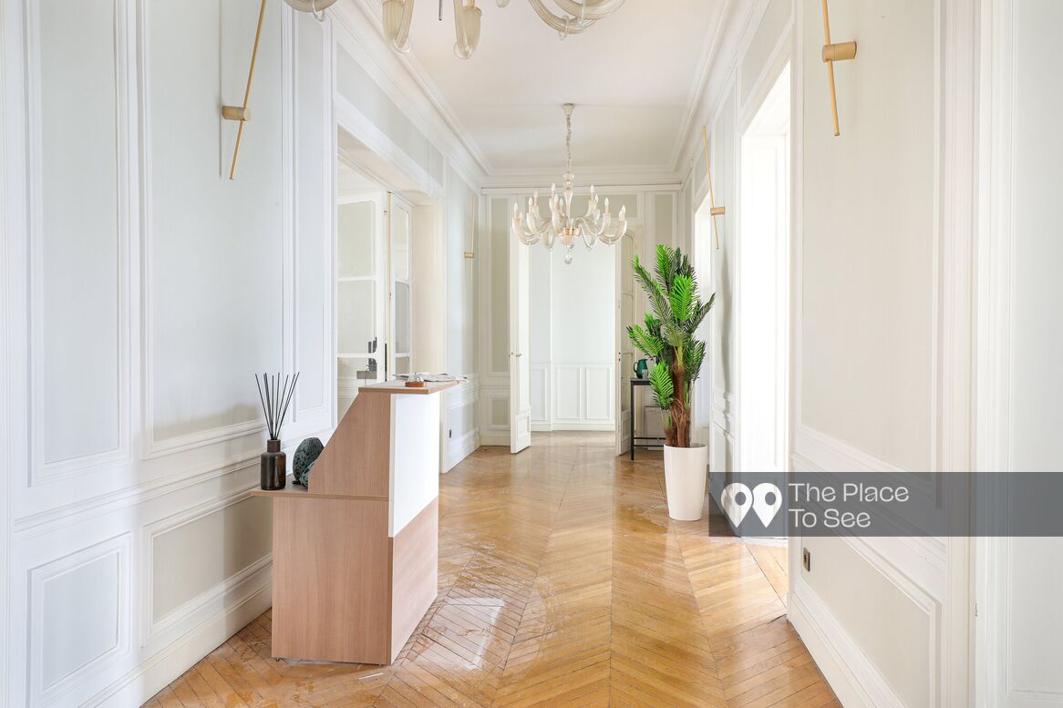 These Haussmann-style offices captivate with their delicate pastel tones, elegant moldings, and herringbone parquet flooring.