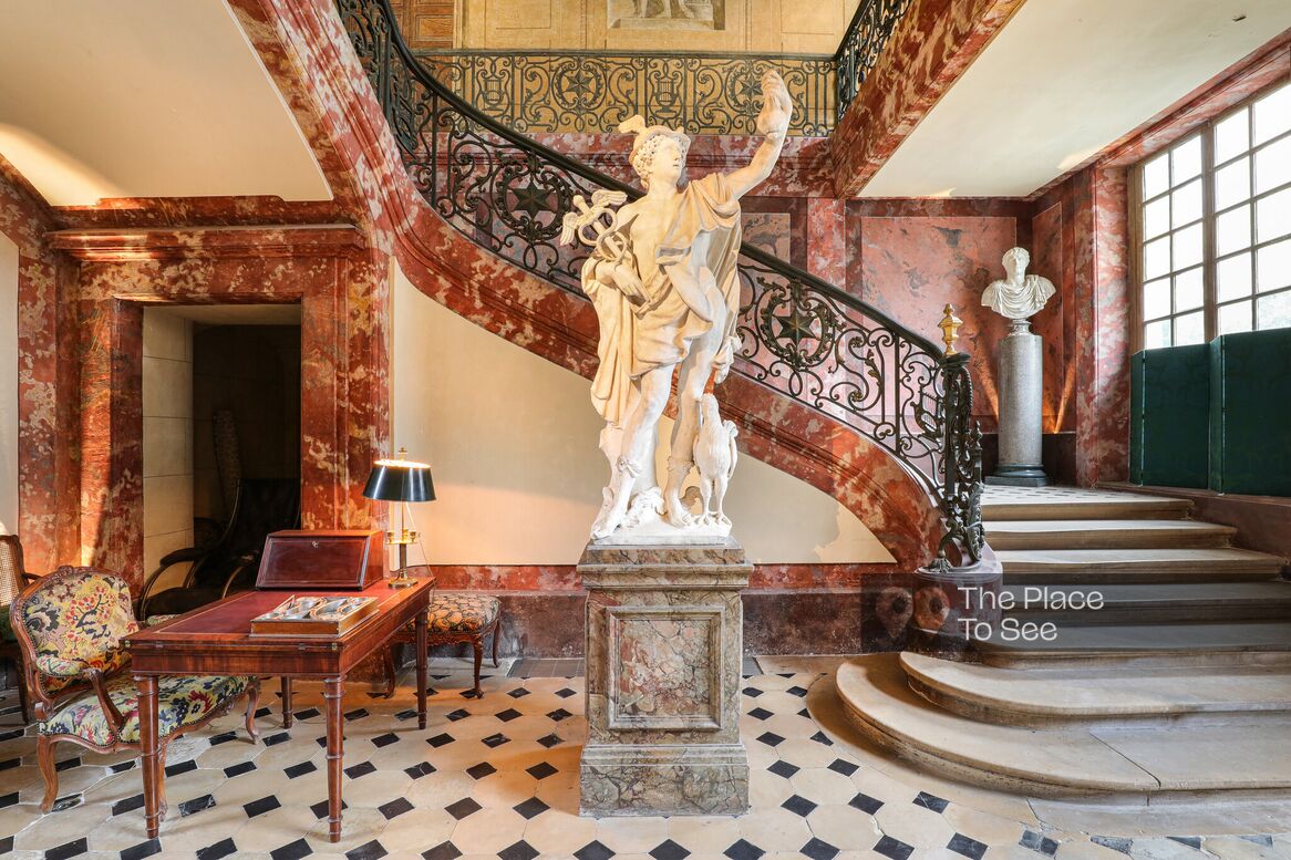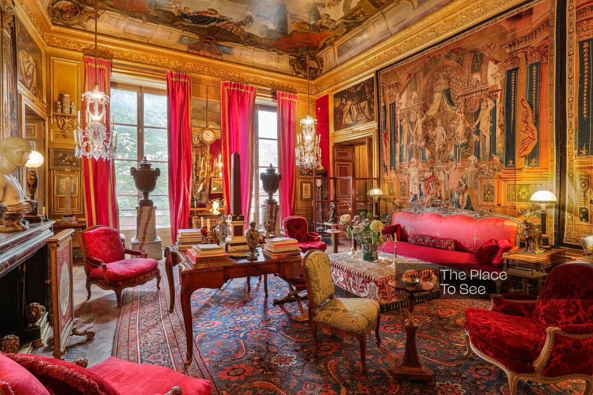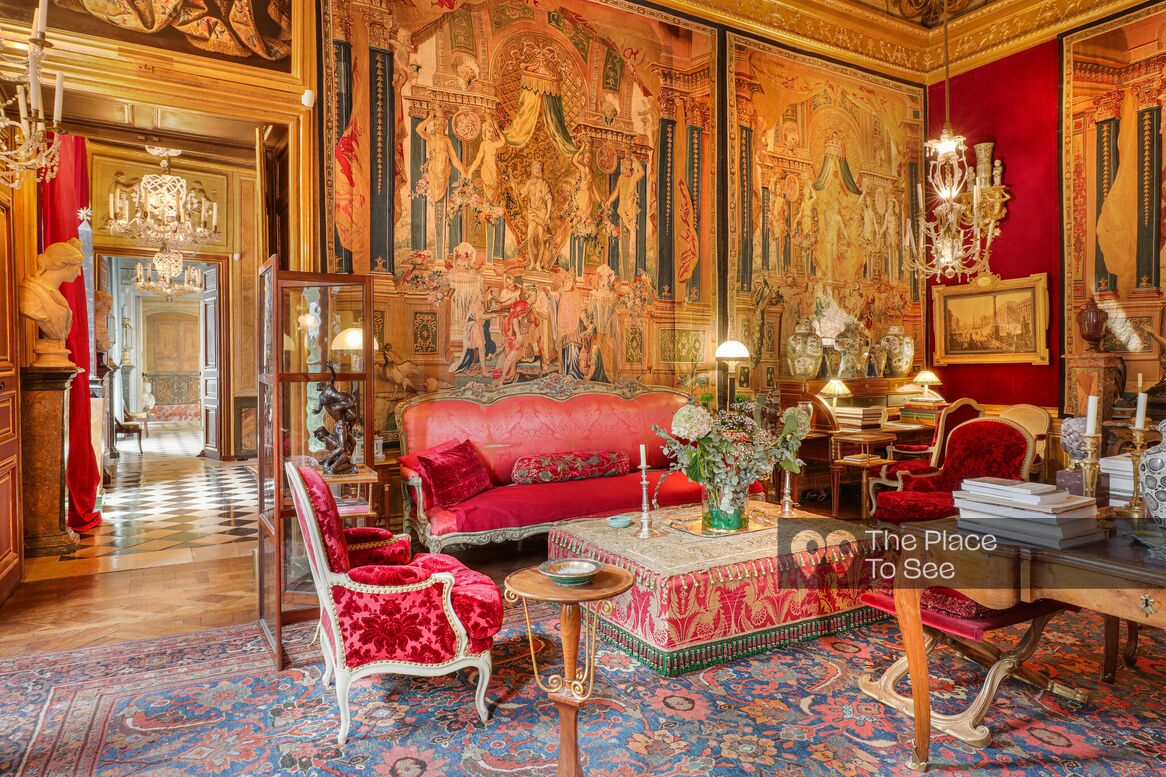 The final, more intimate salon — a true “hall of mirrors” — stands out for its mirrored walls, Asian vases, and direct access to a terrace, providing a rare outdoor space.