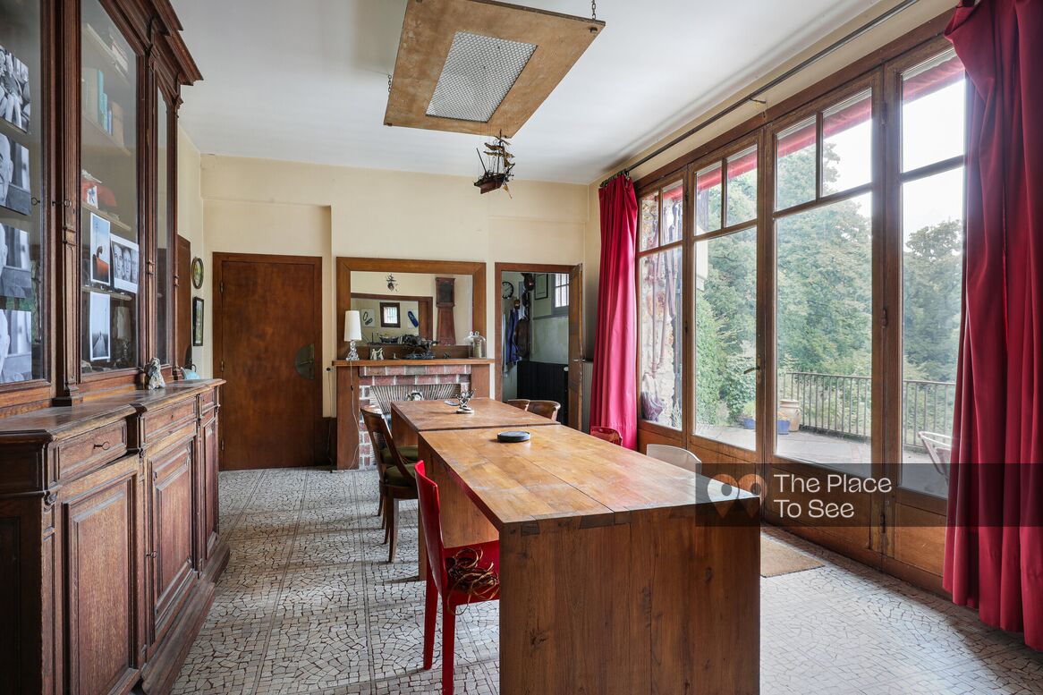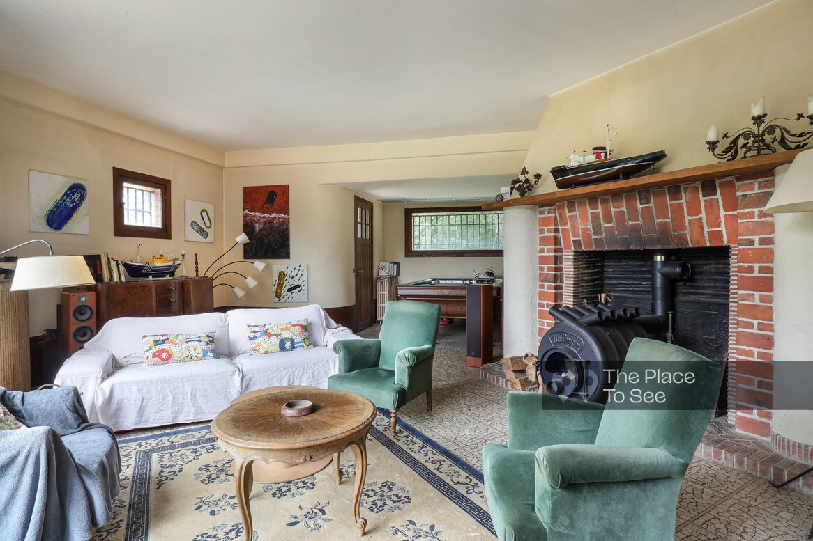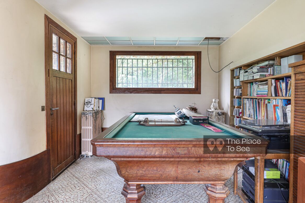 On the raised ground floor, the entrance opens onto a light-filled dining room. A pair of 1930s wooden sliding doors connect this space to the living room with its fireplace and billiard table. Adjacent to the dining room, the period kitchen with a range cooker retains its authenticity. A small, independent apartment completes this level.