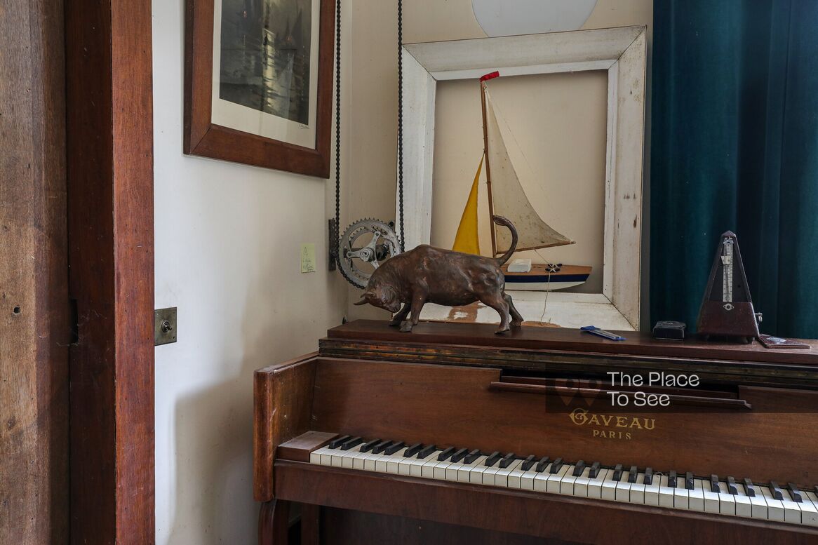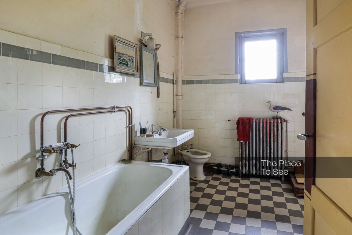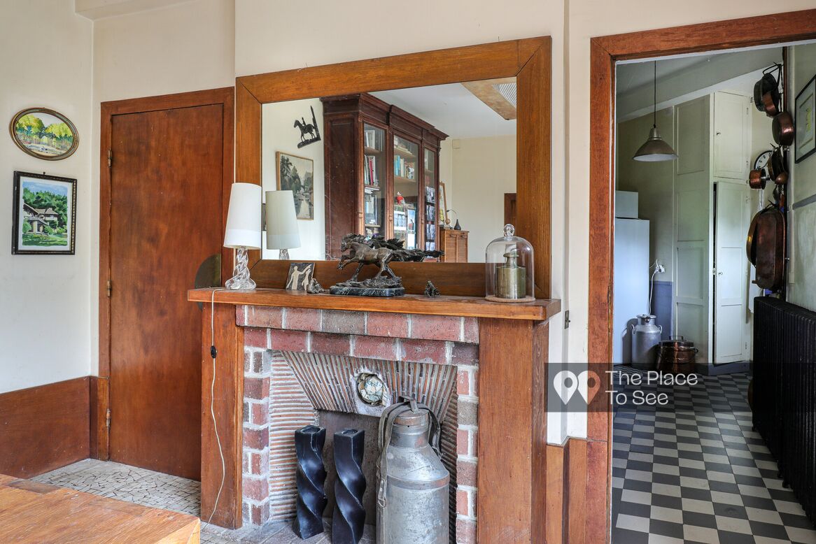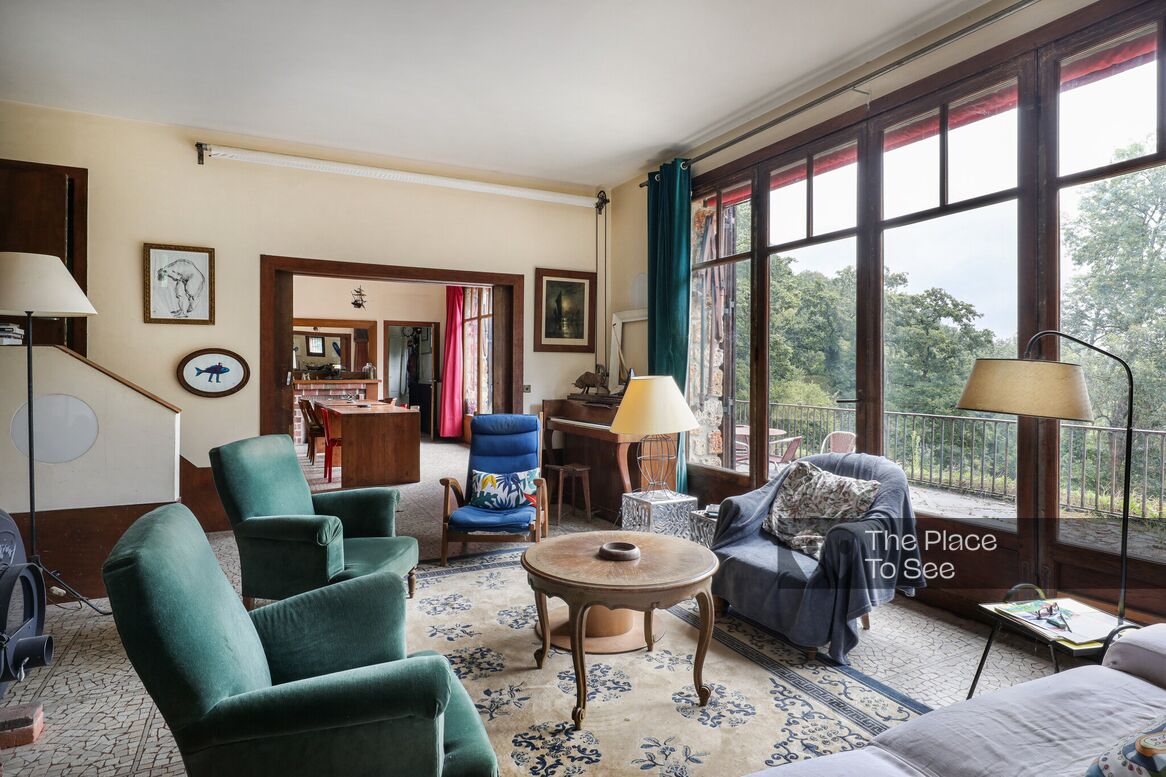 On the raised ground floor, the entrance opens onto a light-filled dining room. A pair of 1930s wooden sliding doors connect this space to the living room with its fireplace and billiard table. Adjacent to the dining room, the period kitchen with a range cooker retains its authenticity. A small, independent apartment completes this level.