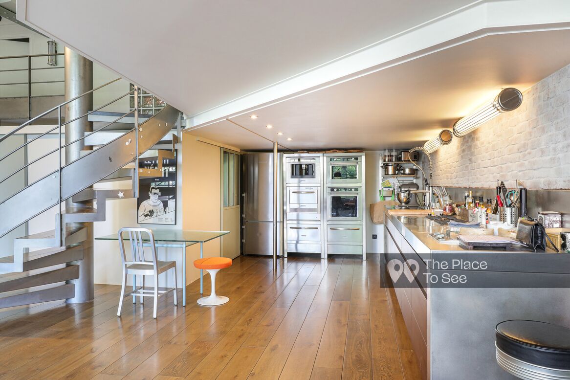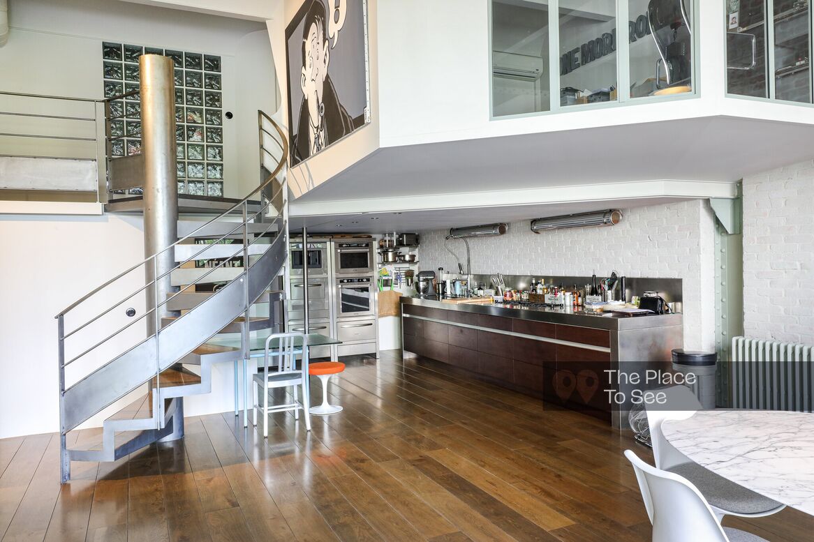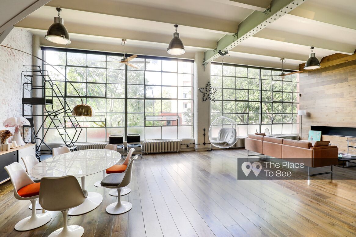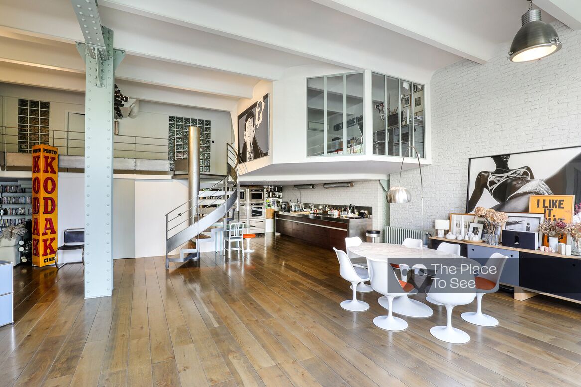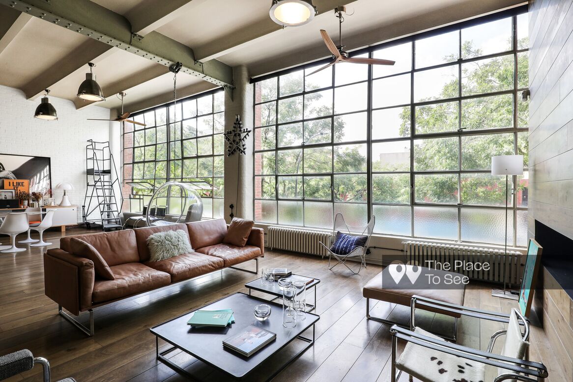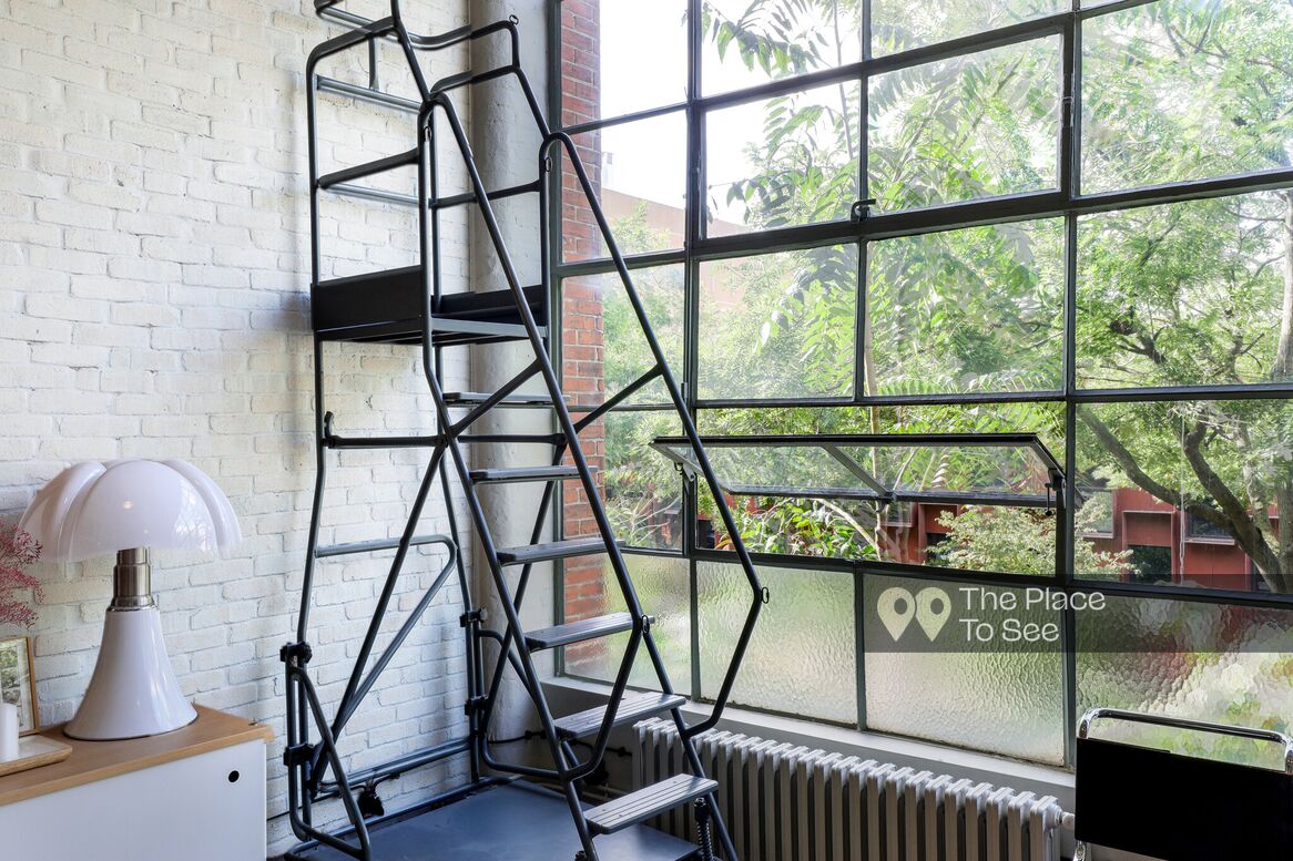 Beautiful New-York style loft in a former factory with large living room. Huge industrial bay window, brick wall, metal beams, fireplace and wood panels.