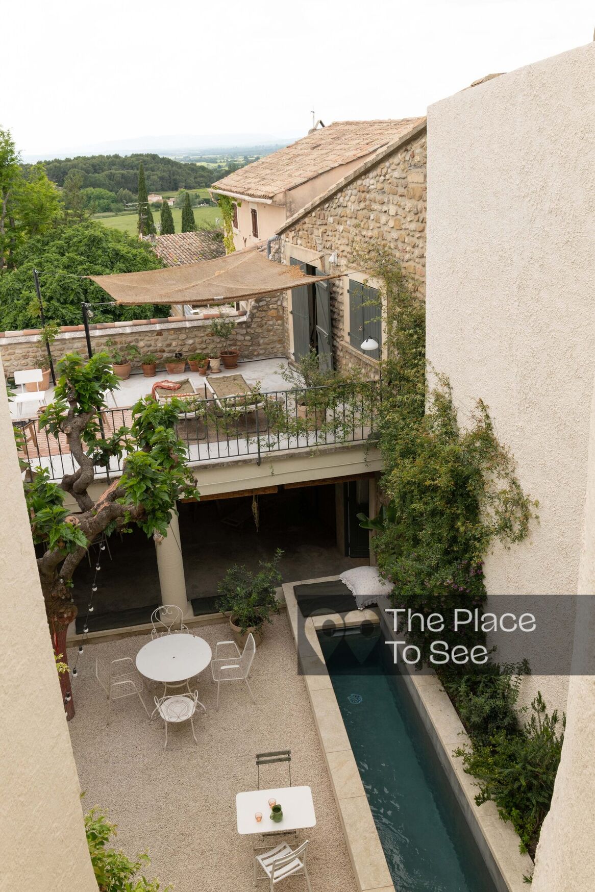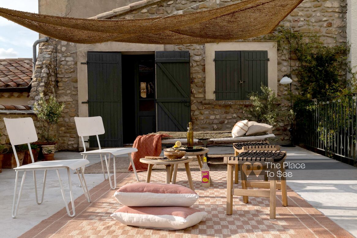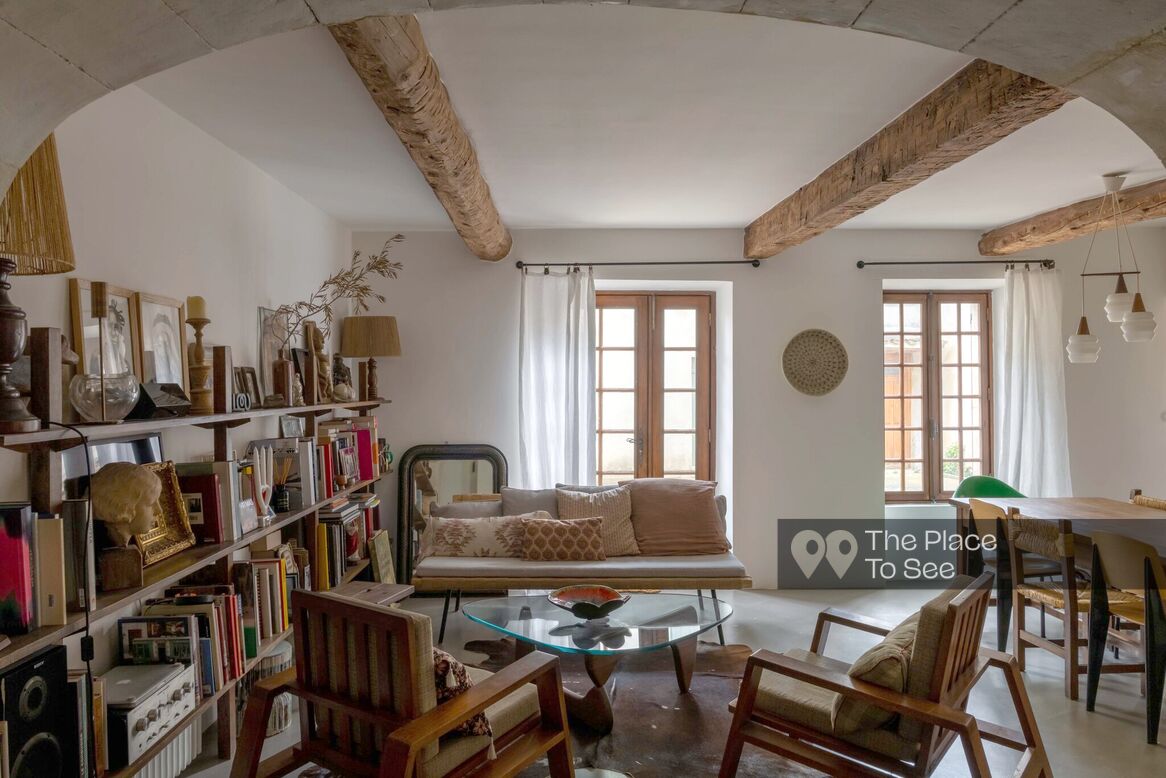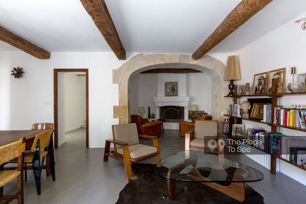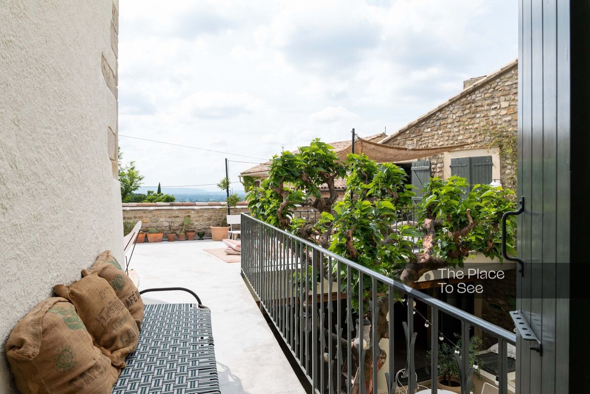 It includes 4 bedrooms each with its own bathroom, a living room with a beautiful library and a fireplace corner, as well as a roof terrace with a panoramic view of the Rhone Valley to enjoy the sunset.
