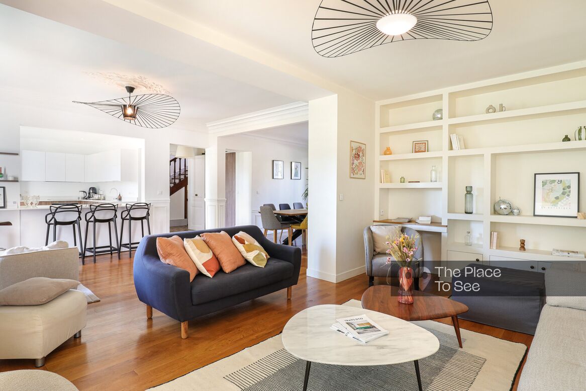 From the living room, a staircase leads to the garden level, a bright landing, a TV lounge, a gym, a home theater, and a bedroom with a shower room, all opening onto the terrace and garden.