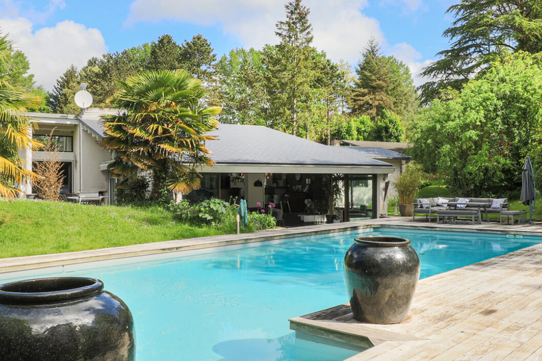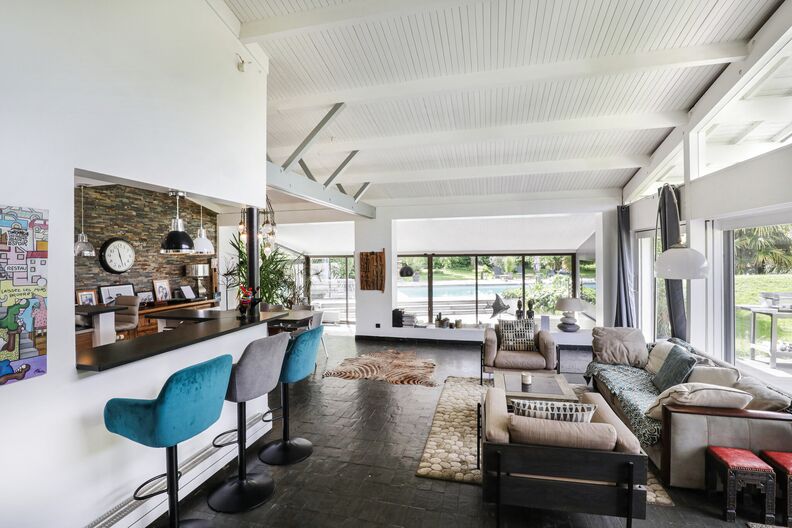Located 30 km east of Paris in a quiet residential neighborhood, this 1960s California-style villa spans 220 m² and features a modern and welcoming design.