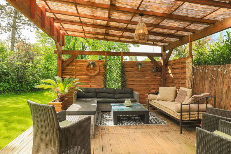 The spacious garden with a wooden terrace completes this bright and inviting setting, making it ideal for fiction shoots seeking a contemporary, lived-in, and authentic home.