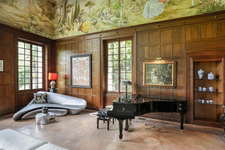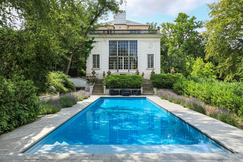 This 19th-century residence, located 55 km west of Paris, stands out for its classic architecture and elegant atmosphere. The main living room, featuring wood paneling and frescoes, opens through large bay windows and houses a Steinway & Sons grand piano, while the décor blends designer furniture with period pieces.