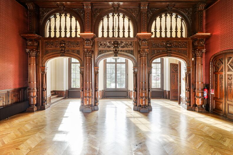 This 18th-century castle, with stone facades and turrets, was chosen for its visual impact and spectacular reception rooms, including a baroque ballroom with exquisite woodwork.