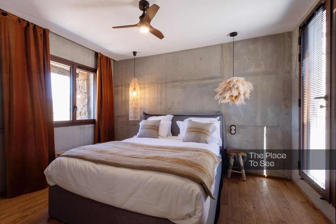 Ancien pressoir à vin, rénové de manière atypique avec une extension en béton.