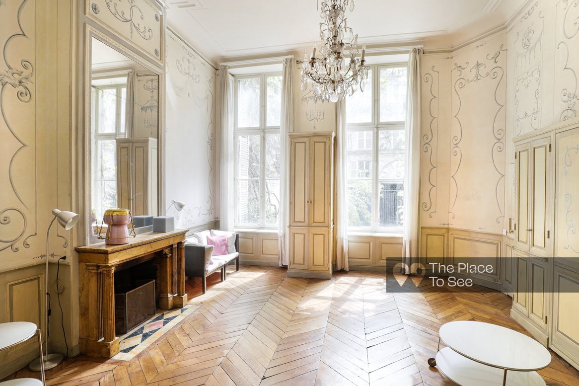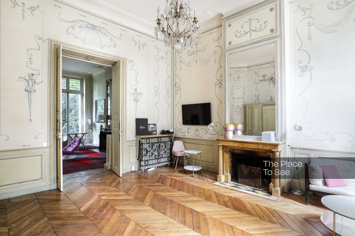 Salon avec grande hauteur sous plafond, cheminée, moulures, parquet et lustre donnant sur la chambre au murs peints.
