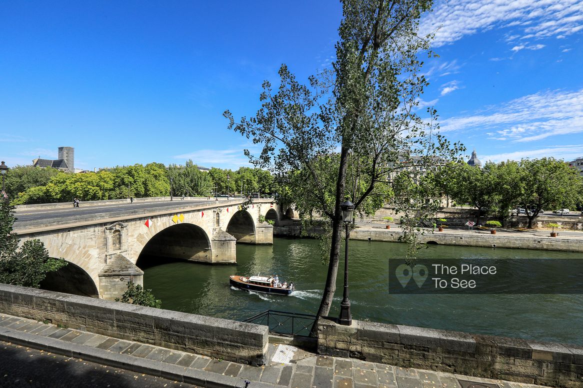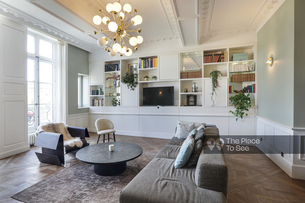 Décor en duplex avec vue sur la Seine d'architecture classique dans un immeuble haussmannien à la décoration moderne et aux murs colorés, parquets et moulures.