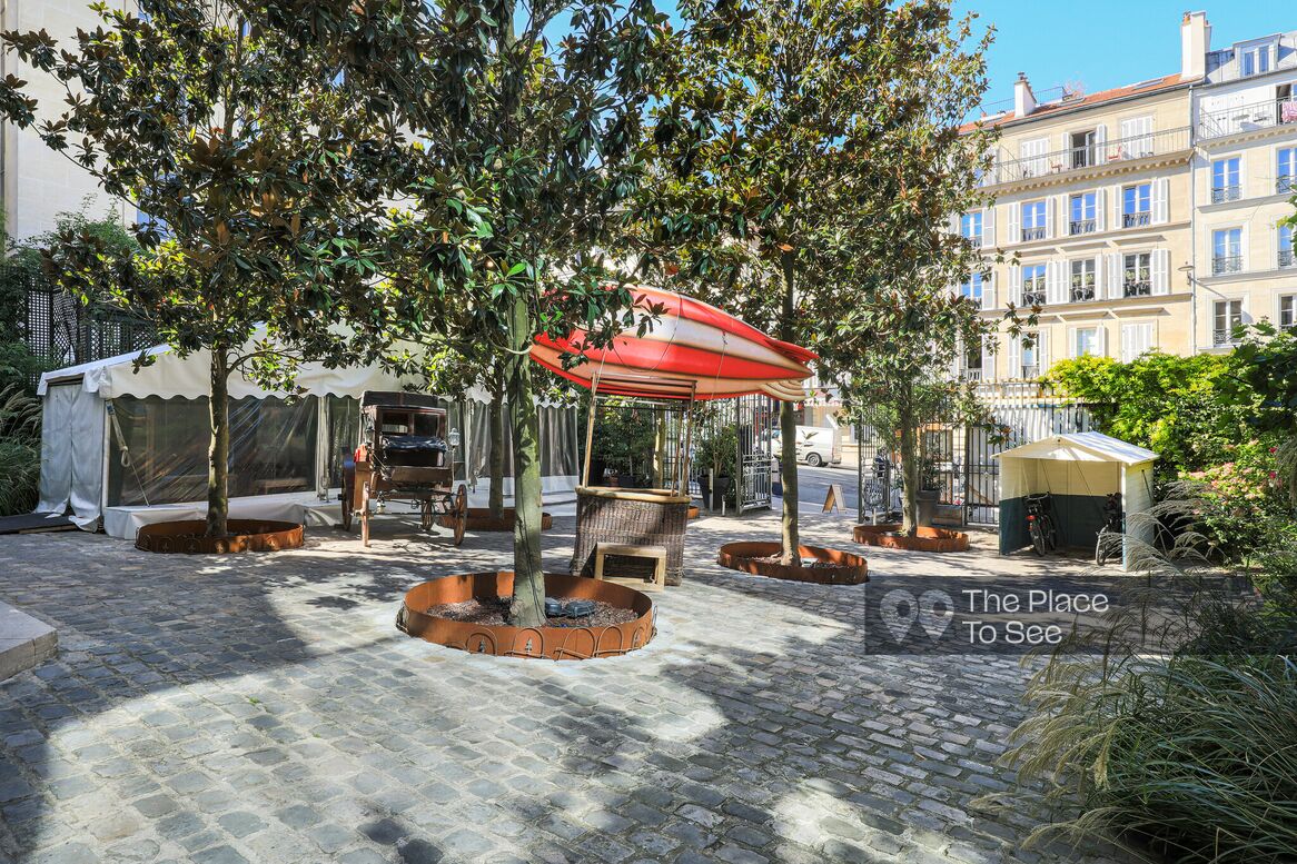 Dès l’entrée, le ton est donné : un magnifique espace café végétalisé, orné d’une petite fontaine et baigné de lumière, s’ouvre sur le jardin. Plus loin, un salon avec bureau classique et cheminée ancienne est enrichi d’une grande bibliothèque.