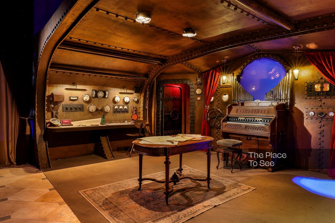 Un couloir plonge le visiteur dans un univers de sous-marin ancien, tandis qu’un bureau singulier abrite une imprimante métallique d’époque et un plafond habillé de papiers suspendus.