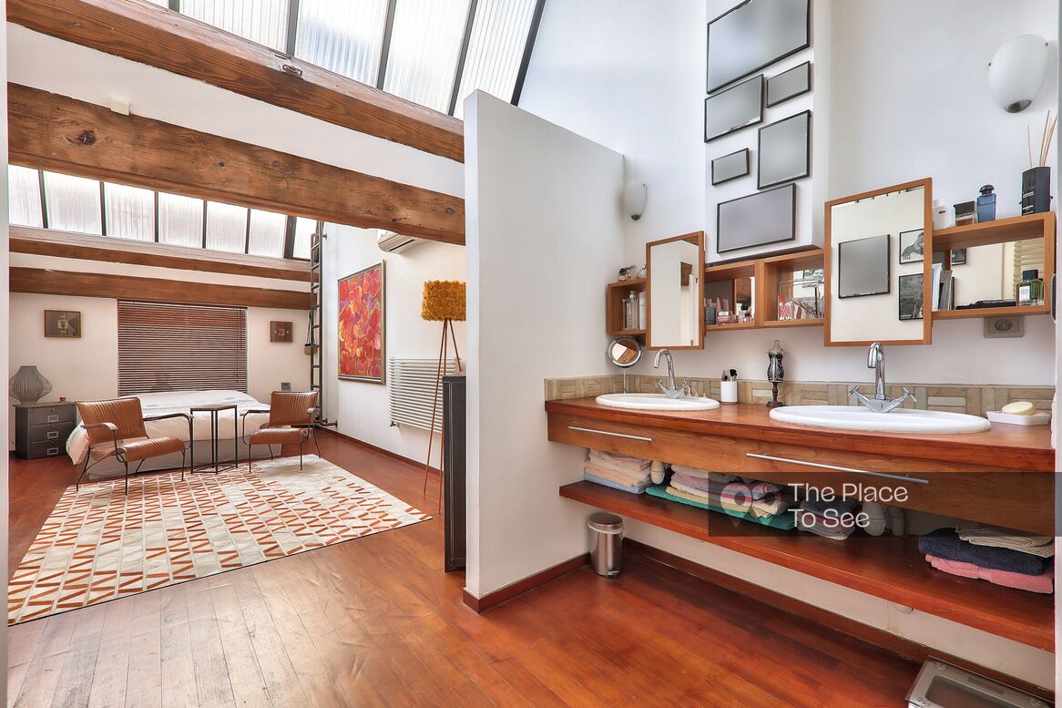 Cet ancien atelier de 291 m² reconverti en magnifique loft met à disposition sa spacieuse pièce de vie décorée de façon moderne, ainsi qu'une grande chambre avec balcon située à l'étage.