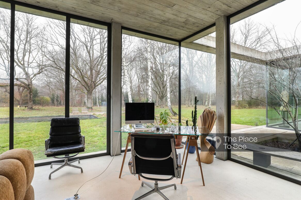 De plain-pied, cette magnifique maison d'architecte brutaliste s'inscrit au milieu d'un joli parc arboré d'une superficie d'un hectare.