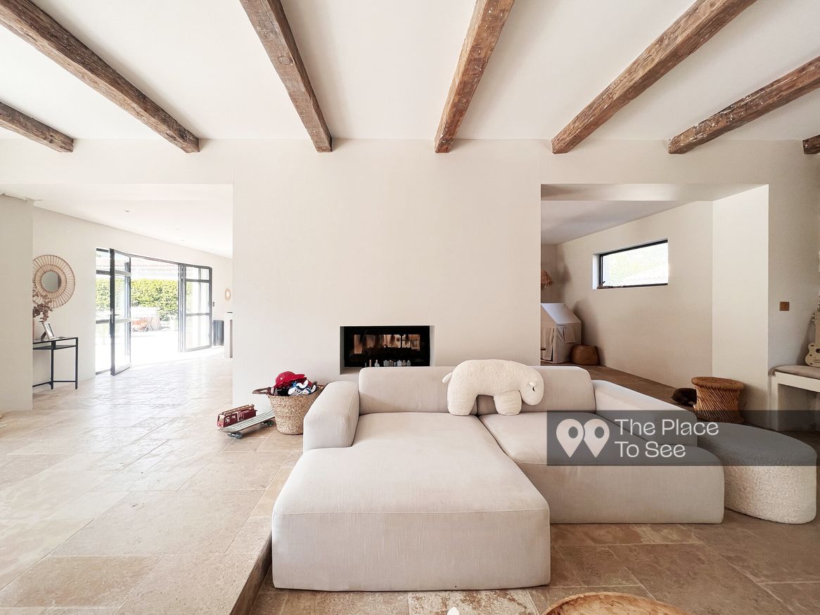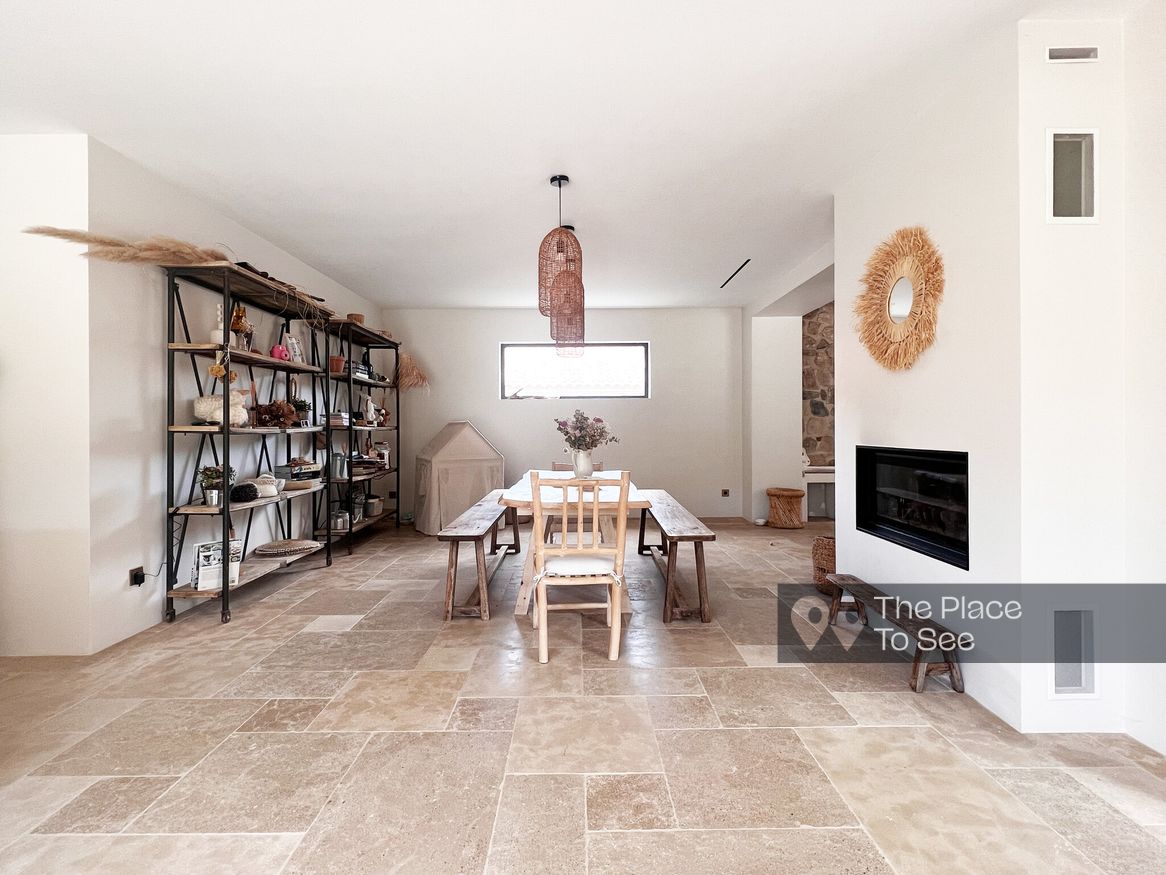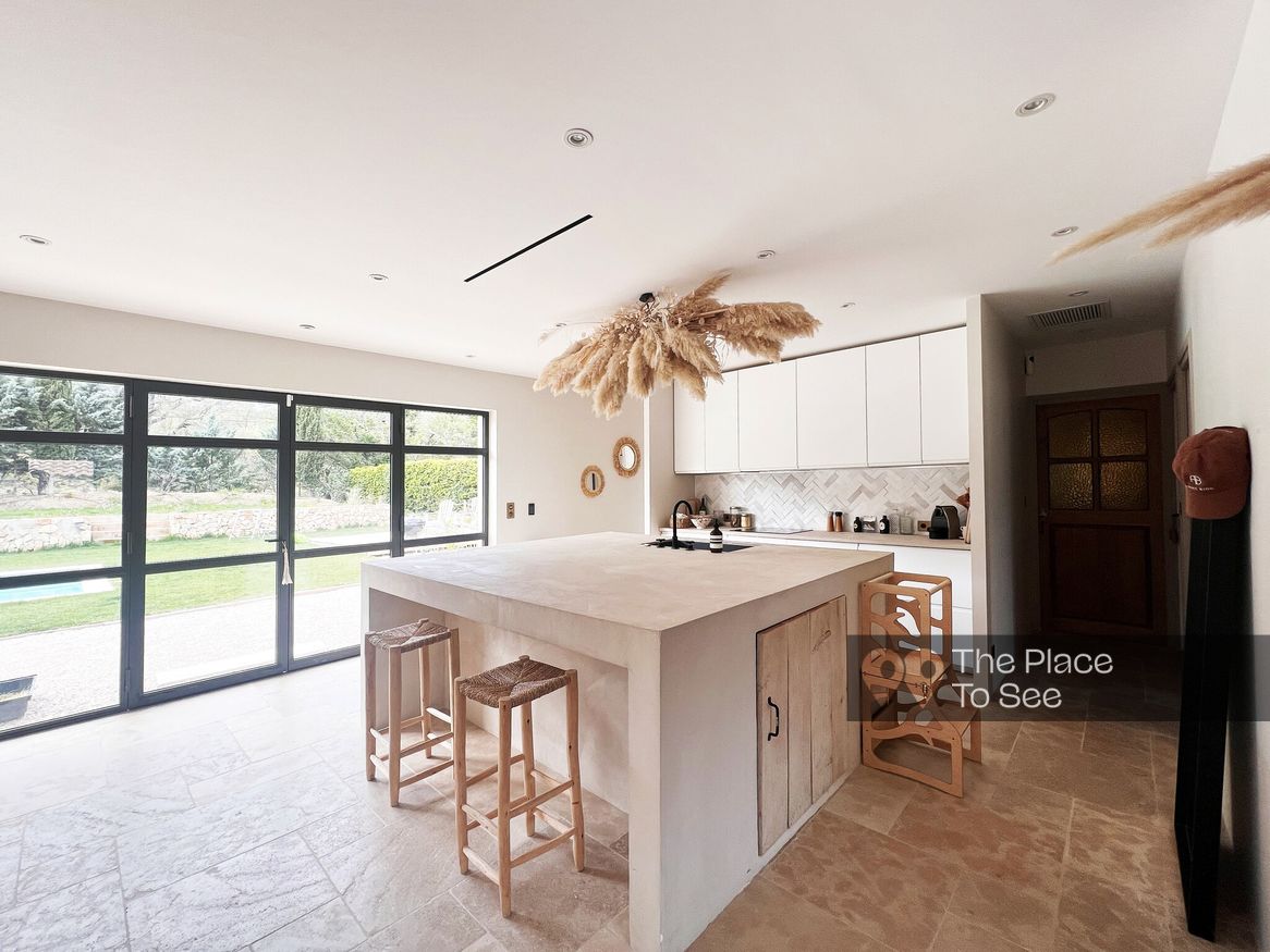 Maison provençale récemment rénovée avec un grand espace ouvert cuisine / salon de plus de 80m2 avec sol en pierre, îlot central en béton ciré et ambiance bohème.