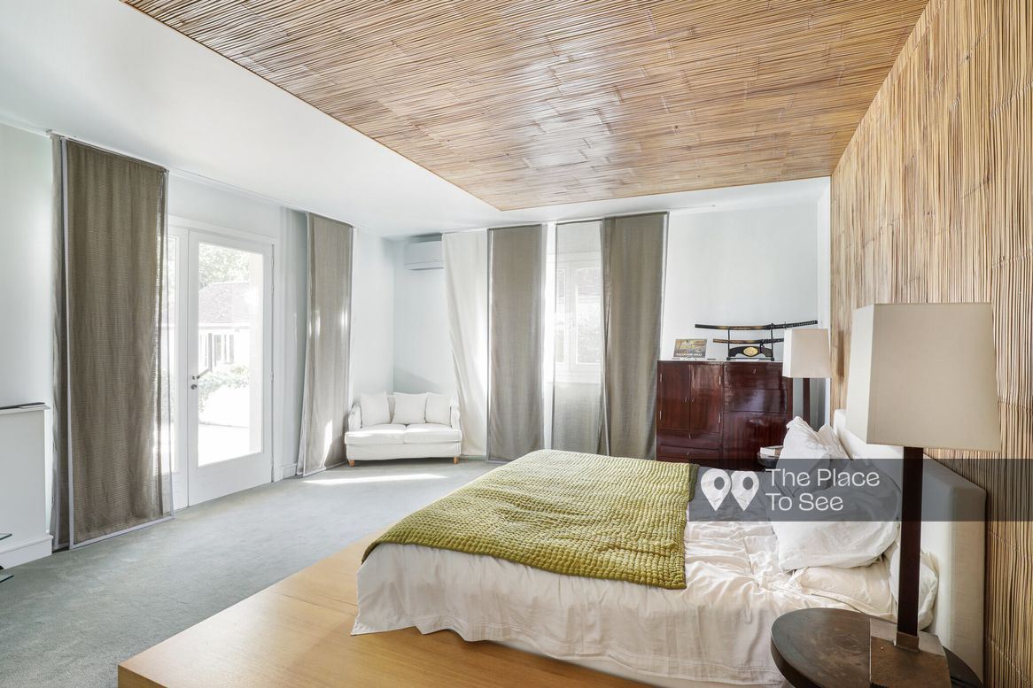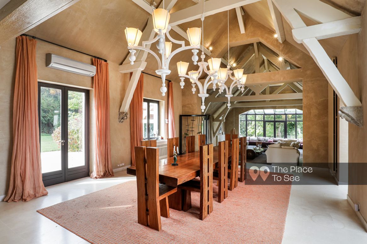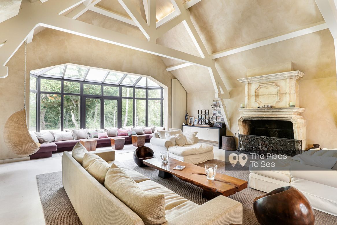 La maison principale distribue depuis le hall, un bureau, un salon musique et une cuisine et un espace de vie de 250 m2 avec en plafond cathédrale (5m) et charpente apparente.