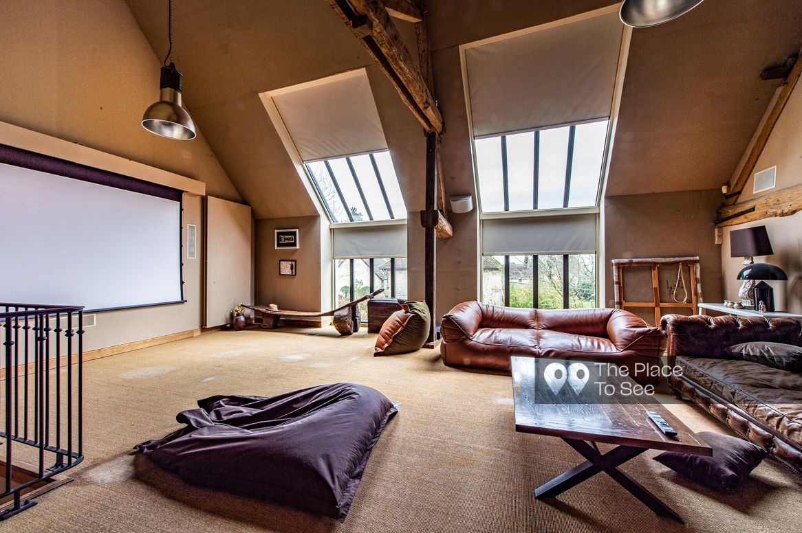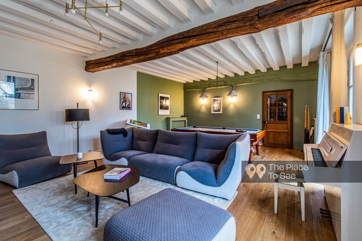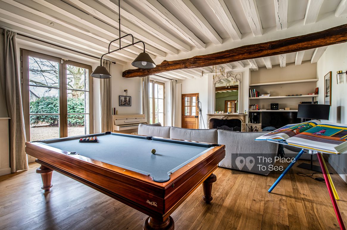 Cette maison de famille dispose d'une grande cuisine / salle à manger ouverte sur l'extérieur, d'une salle de cinéma à l'étage et d'un salon billard avec cheminée ancienne.