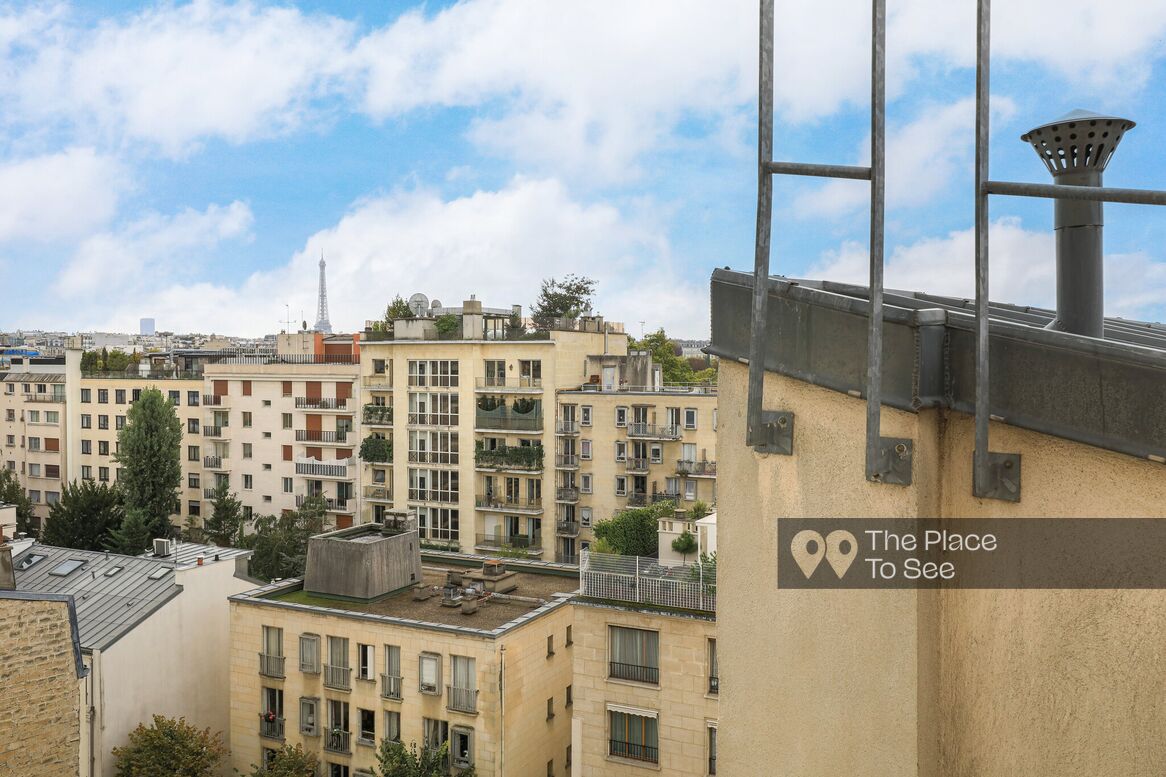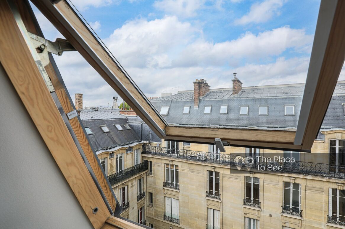 Studio sous les toits, lumineux, idéal pour un petit tournage. Il offre une vue dégagée sur les balcons du dernier étage noble.
