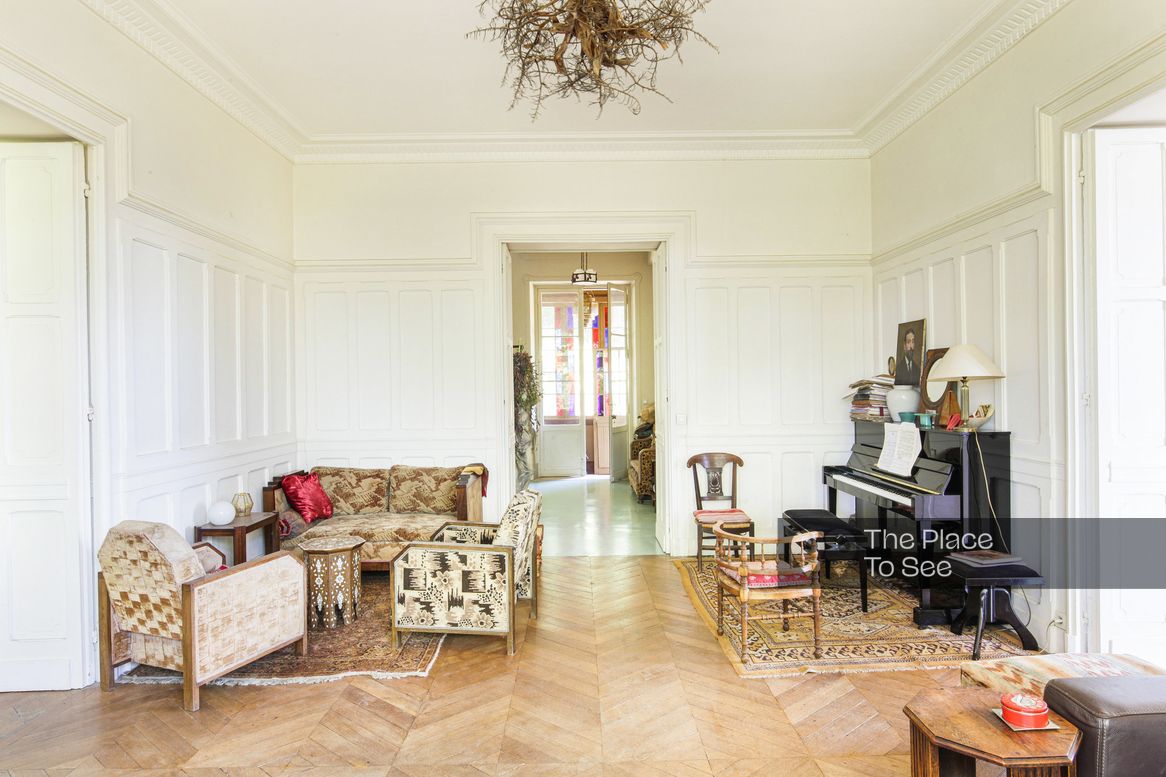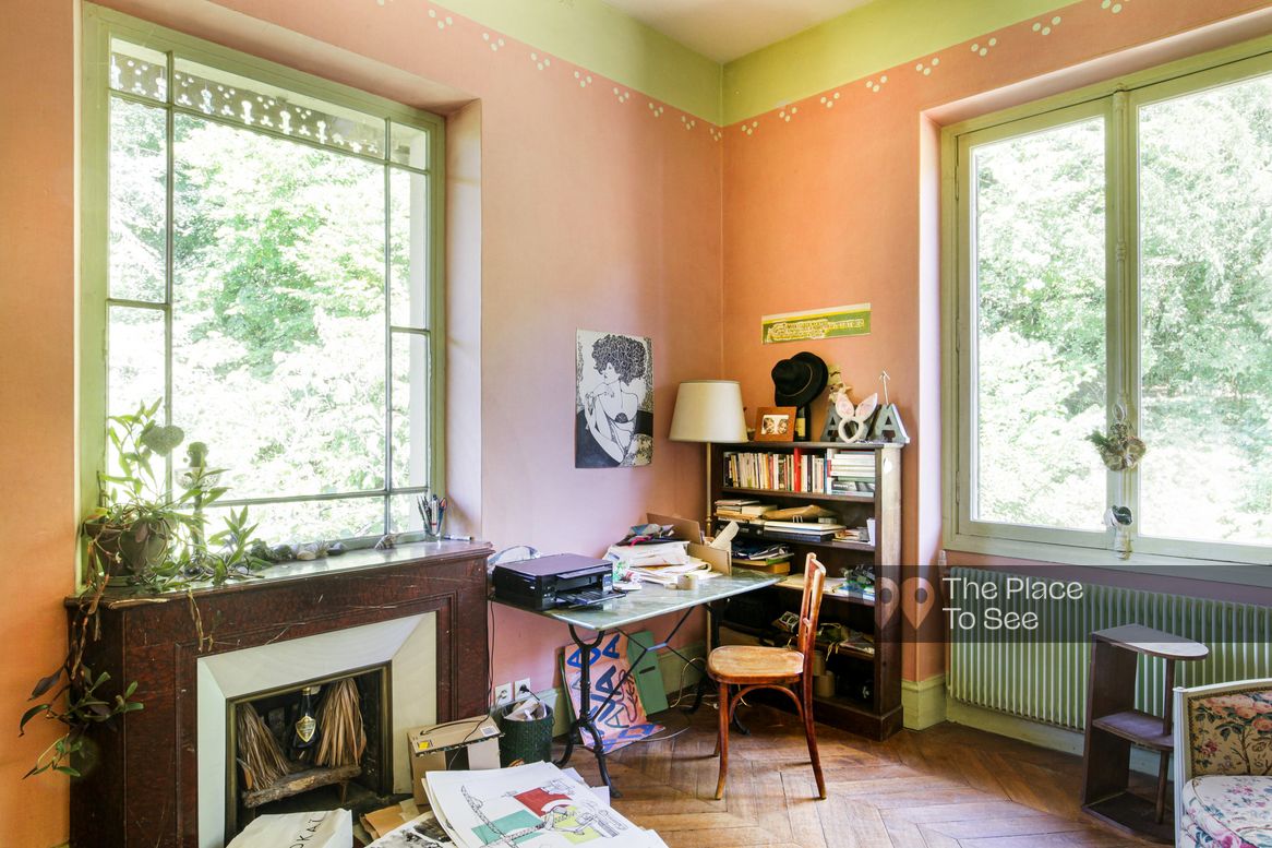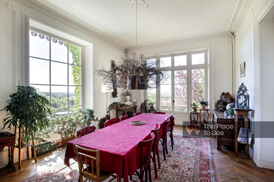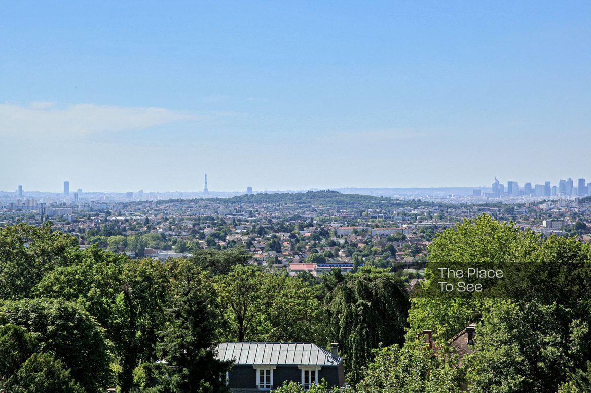 Grande maison type chalet en hauteur avec vue au loin sur Paris et la Défense dans un écrin de végétation.