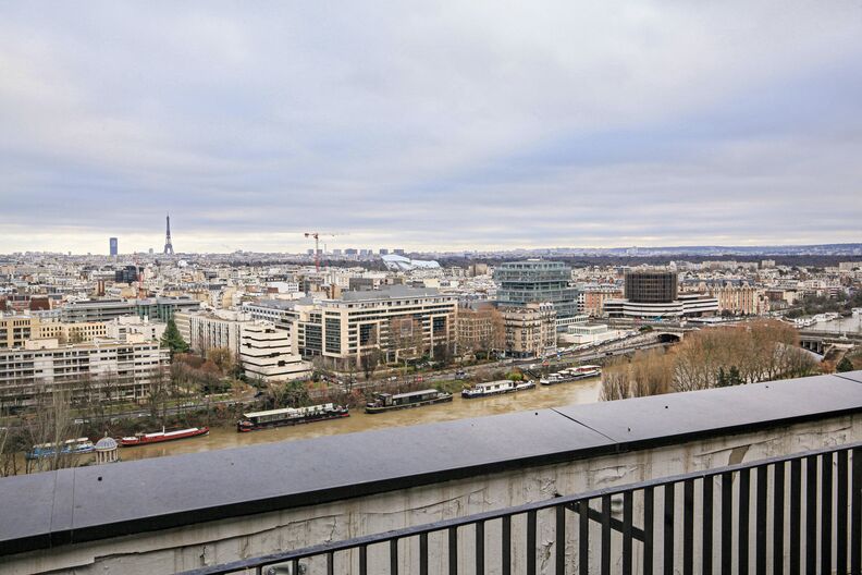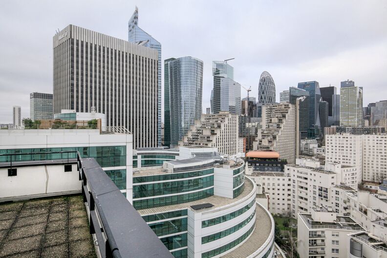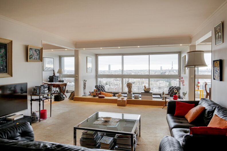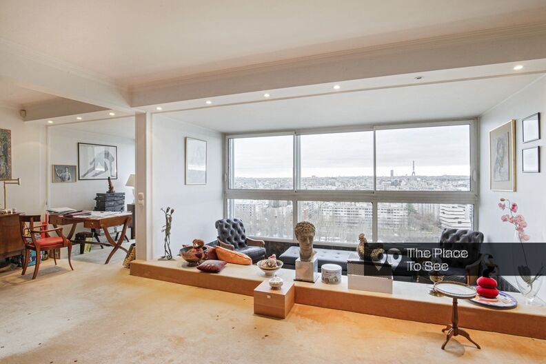 Situé à La Défense, ce penthouse en duplex de 230 m² prend place dans un immeuble des années 70 et se distingue par ses grandes baies vitrées offrant une vue spectaculaire sur la skyline parisienne, avec la Tour Eiffel en ligne de mire.